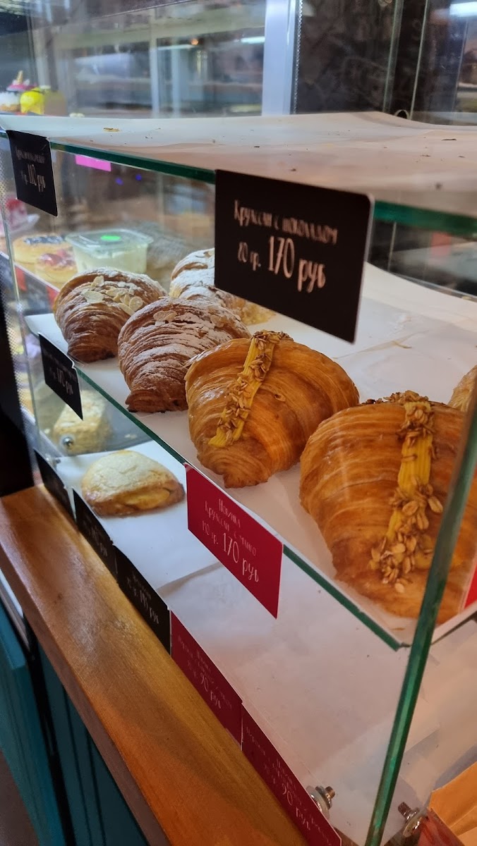 Очень вкусные круассаны. Симпатичное кафе. Дорого. Но висит на стене объяснение этому: продукты только натуральные из фермерских хозяйств. Дают накопительную карту - 7й кофе в подарок. И о кофе: надо помнить основной рецепт отличного кофе - не жалейте заварки! Пока немного жидковат для отличного.